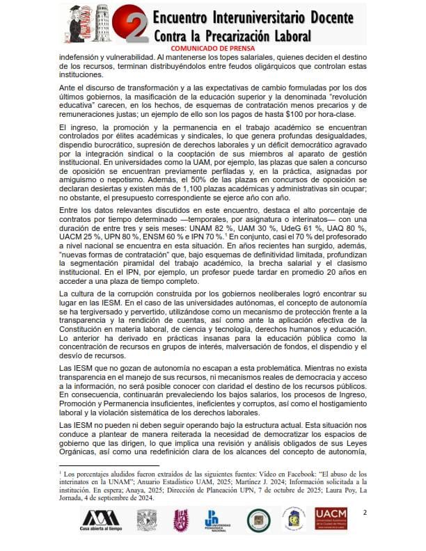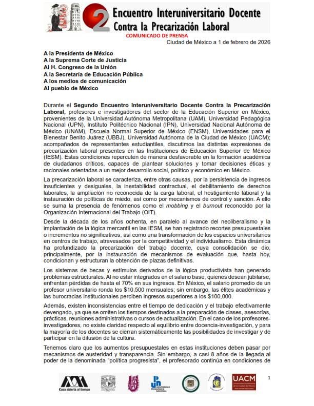 El Segundo Encuentro Interuniversitario Docente Contra la Precarización Laboral se realizó el primero de febrero con la participación del Frente Nacional Interuniversitario (FNI), que integra a la Universidad Autónoma Metropolitana (UAM), Universidad Pedagógica Nacional (UPN), Instituto Politécnico Nacional (IPN), Universidad Nacional Autónoma de México (UNAM), Escuela Normal Superior de México (ENSM), Universidades para el Bienestar Benito Juárez (UBBJ) y Universidad Autónoma de la Ciudad de México (UACM).