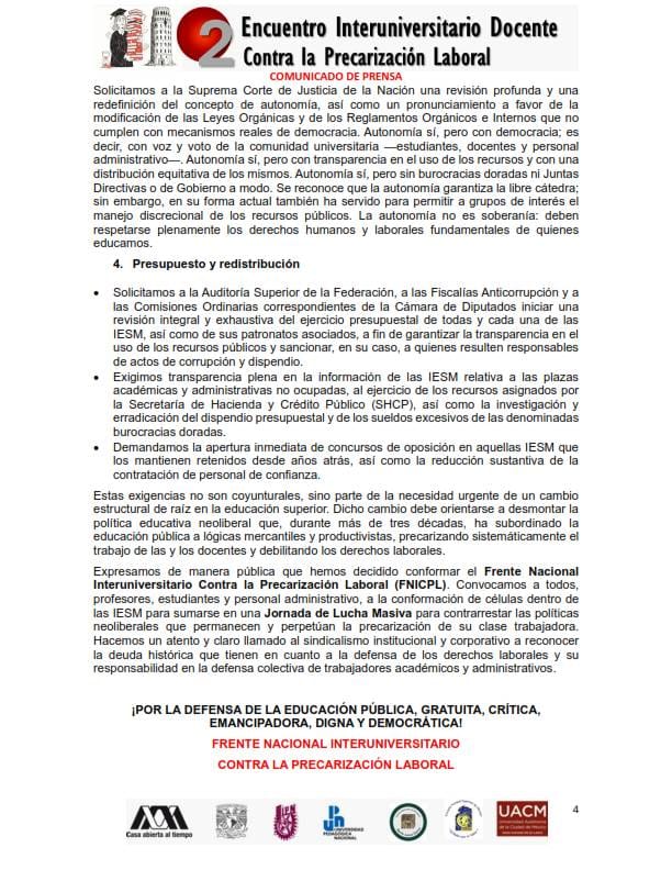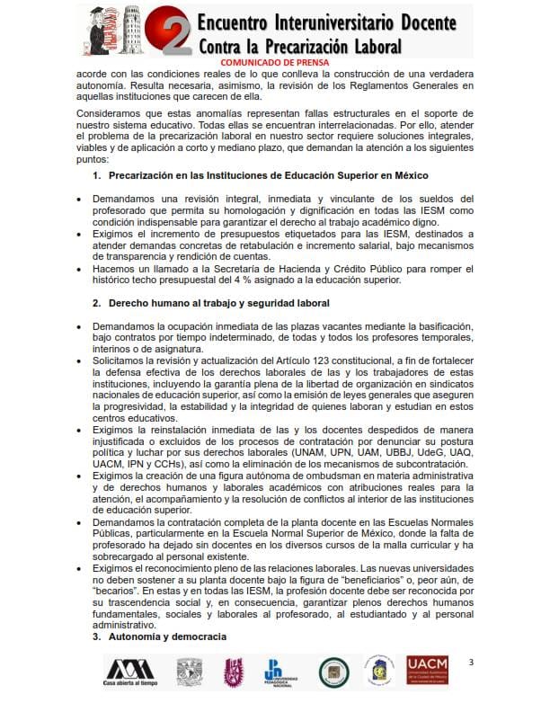 “Estas exigencias no son coyunturales, sino parte de la necesidad urgente de un cambio estructural de raíz en la educación superior. Dicho cambio debe orientarse a desmontar la política educativa neoliberal que, durante más de tres décadas, ha subordinado la educación pública a lógicas mercantiles y productivistas, precarizando sistemáticamente el trabajo de las y los docentes y debilitando los derechos laborales”, finalizan.