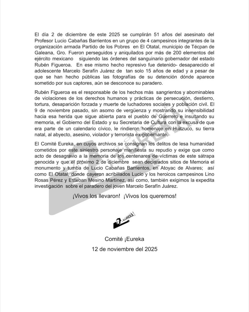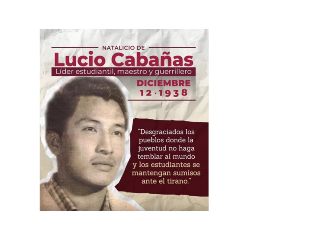 Destaca además el 12 y el 2 de diciembre como los días de nacimiento y muerte respectivamente, de Lucio Cabañas Barrientos, luchador social asesinado en El Otatal, municipio del estado de Guerrero. No olvidemos que Lucio estudió en la Normal Rural Isidro Burgos de Ayotzinapa y desde hace 51 años se sabe que fue brutalmente asesinado por el Ejército Federal Mexicano bajo las órdenes del entonces gobernador Rubén Figueroa. Por eso consideramos que es una burla para el pueblo que en el mismo estado de Guerrero se rinda “homenaje oficial” al exgobernador asesino, como si fuera un héroe.