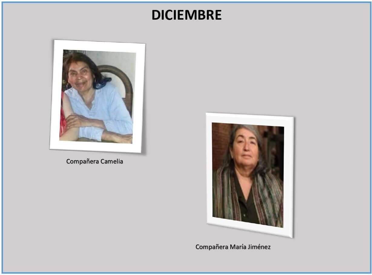 Con diciembre llegan a nuestra memoria algunas fechas para recordar, por compañeros que nacieron o murieron en este mes. Entre ellos está nuestra compañera Camelia, quien nos acompañó en tareas de reconstrucción de La Casa de Todas y Todos durante varios años, y nos apoyó en la presentación de la serie de “Cuadernos Dignificar la Historia” y otras actividades. Recordamos también a la compañera María Jiménez, luchadora social que estuvo con nosotros durante la inauguración de la Casa del Dr. Margil, A.C, en el año 2000.
