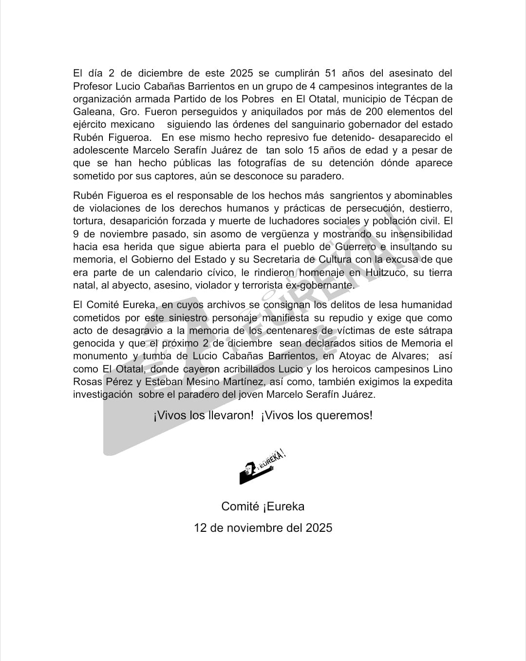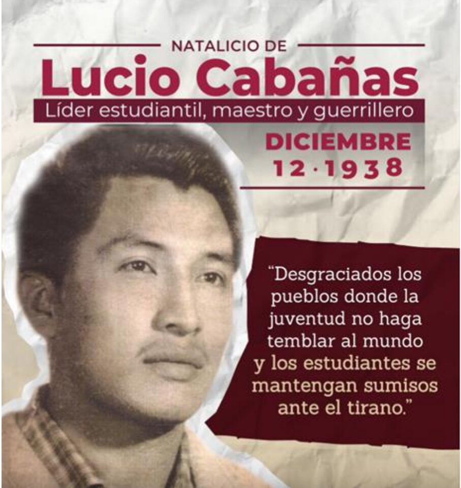Destaca además el 12 y el 2 de diciembre como los días de nacimiento y muerte respectivamente, de Lucio Cabañas Barrientos, luchador social asesinado en El Otatal, municipio del estado de Guerrero. No olvidemos que Lucio estudió en la Normal Rural Isidro Burgos de Ayotzinapa y desde hace 51 años se sabe que fue brutalmente asesinado por el Ejército Federal Mexicano bajo las órdenes del entonces gobernador Rubén Figueroa. Por eso consideramos que es una burla para el pueblo que en el mismo estado de Guerrero se rinda “homenaje oficial” al exgobernador asesino, como si fuera un héroe.