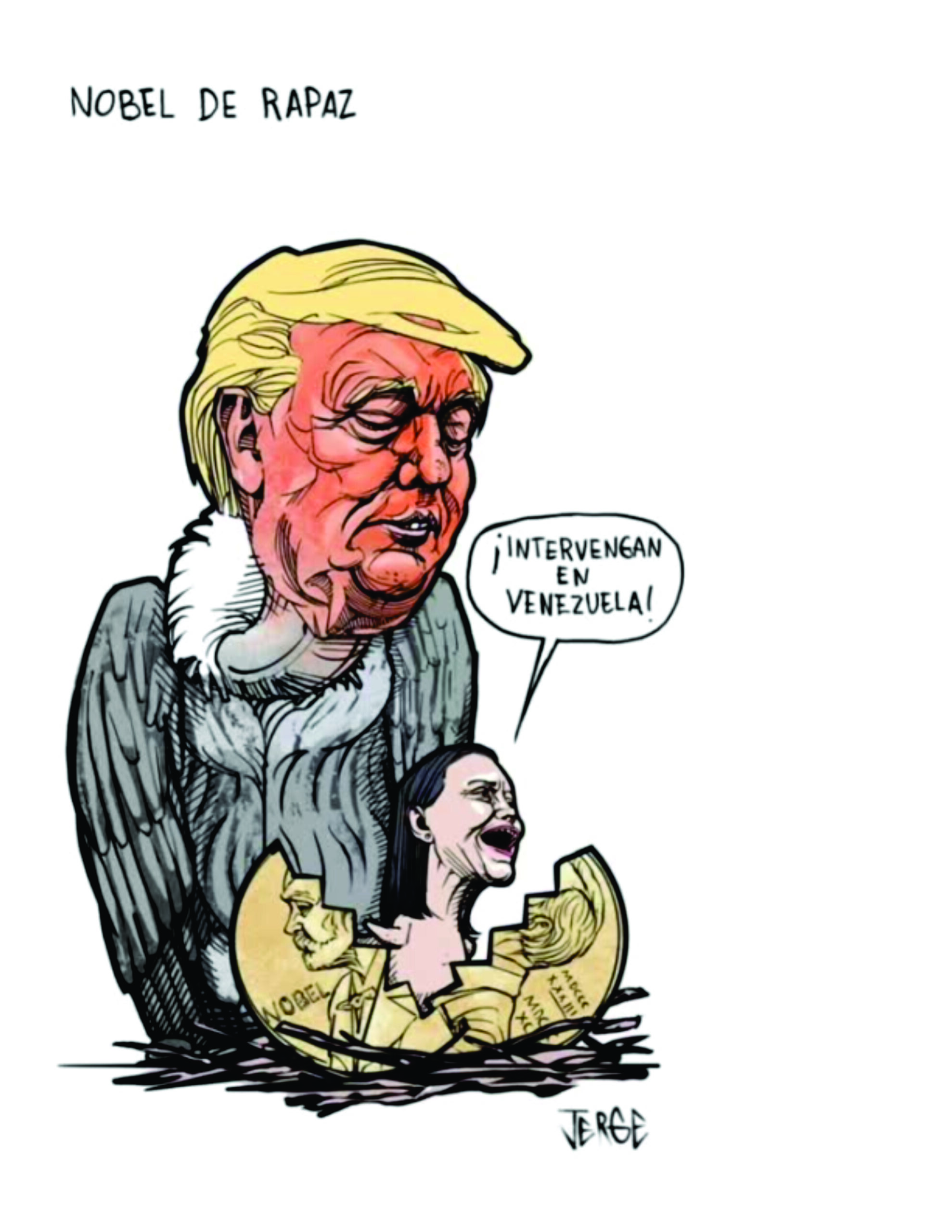 El columnista del periódico La Jornada, Julio Astillero, sostiene que “los poderes gringos buscan consolidarse como instancia de explícita desestabilización de gobiernos (en este caso, abiertamente la CIA), de asesinato de ciudadanos sin juicio o base legal alguna y de uso apabullante de la fuerza militar para forzar el cambio de régimen e instalar a marionetas agradecidas: María Corina Machado y su premio Nobel de la Guerra y el desvaído Edmundo González Urrutia”.